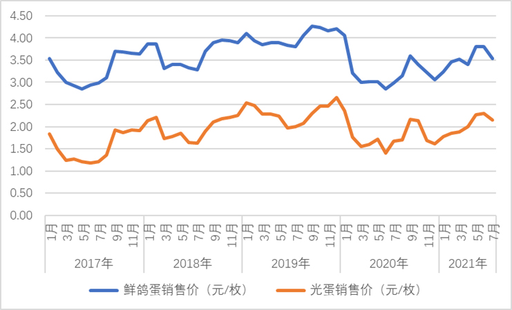7月份,監(jiān)測企業(yè)鴿蛋平均價格有所回落,鮮蛋平均價格為3.54元/枚,環(huán)比下調(diào)7%。其中,最高價為6.5元/枚,最低價為1.6元/枚。光蛋均價為2.15元/枚,環(huán)比下調(diào)6%,其中最高為4.5元/枚,最低為0.7元/枚。不同地區(qū)不同企業(yè)鴿蛋價格差異較大。