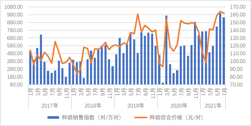 價格方面,種鴿綜合評估價格指數(shù)為162元/對,環(huán)比下降1%,但同比看仍處于較高水平。從結(jié)構(gòu)來看,種鴿月齡差異導(dǎo)致價格差距較大,最高價位為230元/對,最低為45元/對。從趨勢估計,種鴿市場后期可能會進一步降溫下調(diào)。