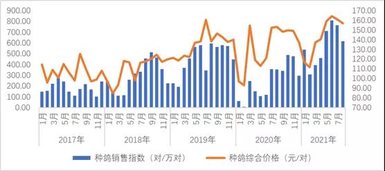 8月份,種鴿綜合價格為157.13元/對,環(huán)比下調(diào)2.5%,波動指數(shù)為0.27,為一般波動。結(jié)構(gòu)上看,青年鴿價格較穩(wěn),童鴿價格有所下調(diào)。最高價為230元/對,最低為45元/對。銷量方面,監(jiān)測企業(yè)種鴿銷售指數(shù)為617.24,環(huán)比下降19%,往年同期銷量一般上漲,可見雖然銷量比同期高,但仍保持上期降溫下調(diào)的趨勢。結(jié)構(gòu)上看,種鴿銷量變動的企業(yè)中,下降的占多數(shù)。