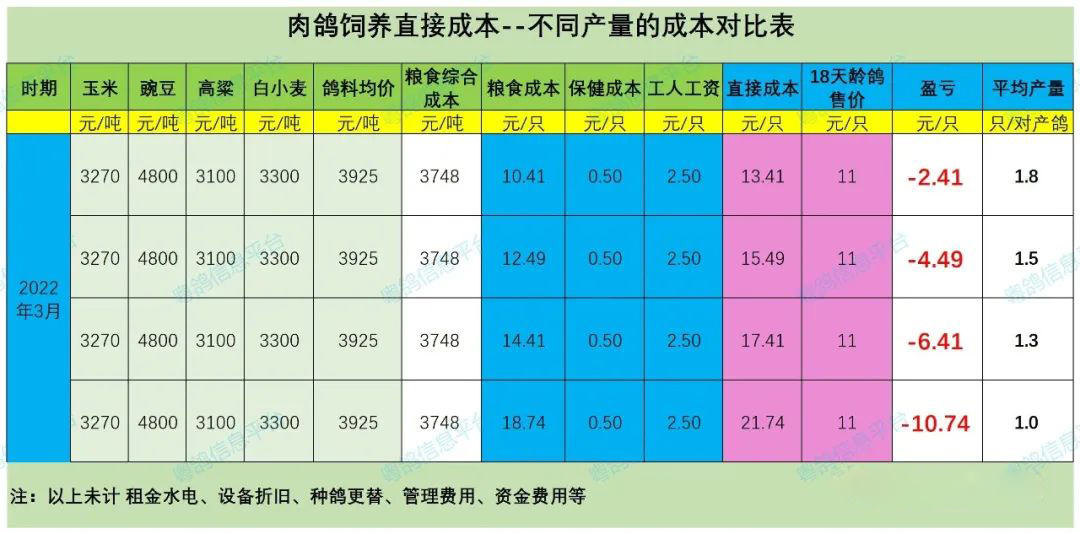 肉鴿從平均產(chǎn)量1.8、1.5、1.3、1.0 分別糧食成本為10.41元/只、12.49元/只、14.41元/只、18.74元/只,養(yǎng)鴿企業(yè)由于產(chǎn)量下降,導(dǎo)致單位生產(chǎn)成本大幅遞增。