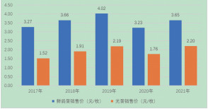 2021年,鮮鴿蛋平均價格為3.65元/枚,比2020年高0.42元/枚;光蛋價格為2.20元/枚,比2020年高0.44元/枚。