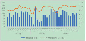 根據(jù)監(jiān)測情況來看,種鴿市場表現(xiàn)較好,2021年種鴿累計銷售量為近年來的最高水平。全年種鴿綜合價格平均水平為140元/對,也是近5年的最高水平。2021 年種鴿價格和銷量表現(xiàn)較好,一定程度上反映下游養(yǎng)殖場擴產(chǎn)的意愿,以及對2020年以后市場產(chǎn)能下降有比較高的預期。