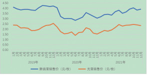 2021年全年以穩(wěn)中回升為主。鮮鴿蛋和光蛋價格走勢基本-致,1 月份最低(鮮鴿蛋3.17元/枚;光蛋1.70元/枚), 10月份最高(鮮鴿蛋4.03元/枚;光蛋2.46元/枚)。