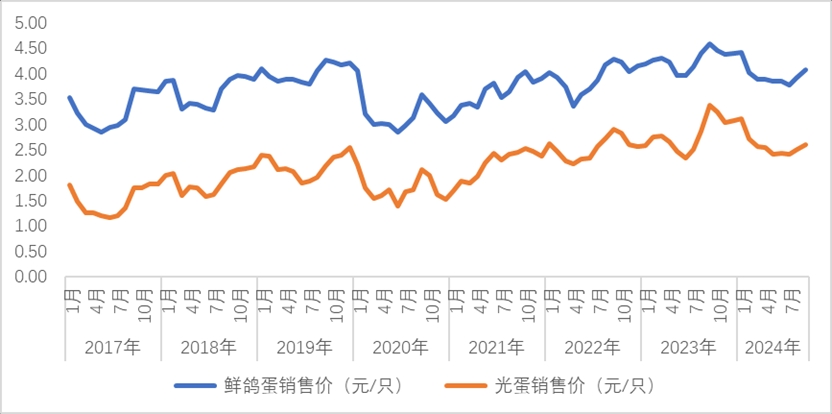 本期,鴿蛋價(jià)格4.08元/枚左右,光蛋價(jià)格則為2.6元/枚,環(huán)比上漲3%-4%,為一般性波動(dòng)。從結(jié)構(gòu)上看,本期鴿蛋價(jià)格穩(wěn)中有升,未出現(xiàn)蛋價(jià)下跌的情況,價(jià)格處在季節(jié)性上漲階段,符合預(yù)期。