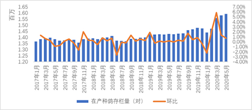5月份,監(jiān)測企業(yè)在產(chǎn)種鴿存欄量約為159萬只,環(huán)比增長0.76%,增速放緩,但與近年同期相比,該增速依然表現(xiàn)最好。自2月份開始,產(chǎn)鴿產(chǎn)能因?yàn)槎喾N原因已經(jīng)連續(xù)增長了4個(gè)月。從結(jié)構(gòu)上看,本月份監(jiān)測企業(yè)產(chǎn)能未出現(xiàn)減產(chǎn)現(xiàn)象。