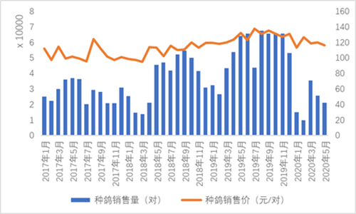 5月份,監(jiān)測企業(yè)種鴿銷量環(huán)比下降18%,而近年同期一般為增長階段,表明市場的引種積極性仍有所下調(diào)。從結(jié)構(gòu)上看,僅有極少數(shù)企業(yè)的銷量有所回升,多數(shù)不銷售或少銷售。價(jià)格以下調(diào)為主,最低價(jià)格下調(diào)到34元/對(duì),但高的有200元/對(duì),這種價(jià)差主要是日齡的原因,由養(yǎng)殖場根據(jù)客戶需要定制。總體來看,5月份種鴿銷售量價(jià)齊跌。
