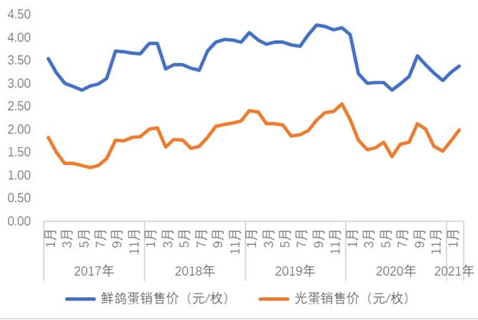 1-2月份,監(jiān)測企業(yè)鴿蛋價格環(huán)比分別增加6%和4%,其中2月份鴿蛋平均價格增至3.38元/枚,絕大多數(shù)企業(yè)鴿蛋價格在3元/枚以上。