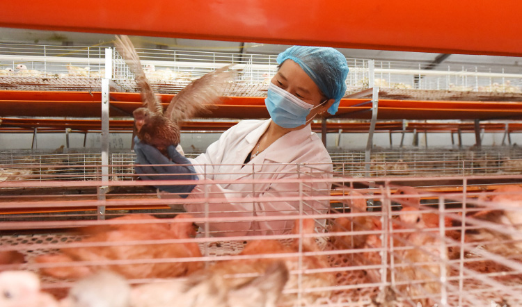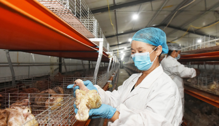 2021年7月20日,位于河北省曲周縣的邯星農業(yè)科技有限公司的員工在鴿舍內查看肉鴿長勢。