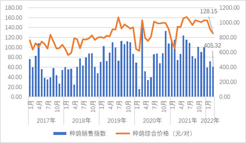 本期,監(jiān)測(cè)企業(yè)種鴿月平均綜合價(jià)格為128.15元/對(duì),環(huán)比下降6%。銷售指數(shù)為405.32,環(huán)比下降15%。從季節(jié)性看,種鴿3月份價(jià)格和銷量環(huán)比均有上調(diào)趨勢(shì),因此本期種鴿市場(chǎng)的低迷值得關(guān)注。從結(jié)構(gòu)看,有監(jiān)測(cè)企業(yè)因當(dāng)?shù)匾咔樵?,鴿產(chǎn)品無法銷售,進(jìn)而拉低了加權(quán)價(jià)格。但從其它企業(yè)的表現(xiàn)來看,正常銷售的企業(yè),種鴿價(jià)格不變,甚至是上調(diào),符合預(yù)期。銷量方面,與價(jià)格表現(xiàn)有所區(qū)別,增減企業(yè)數(shù)量差距不大,但下調(diào)企業(yè)的銷量更多,從而拉低了整體銷量下滑。一季度,種鴿季度平均價(jià)格為140元/對(duì),高于近五年同期水平。季度銷量指數(shù)為1280.54,處于近五年的低位。因此,從價(jià)格看,種鴿價(jià)位比較堅(jiān)挺,銷量隨著新冠肺炎疫情被有效控制后方有所緩解。
