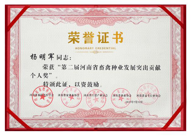 天成鴿業(yè)董事長楊明軍榮獲“河南省畜禽種業(yè)發(fā)展突出貢獻(xiàn)個(gè)人獎(jiǎng)”