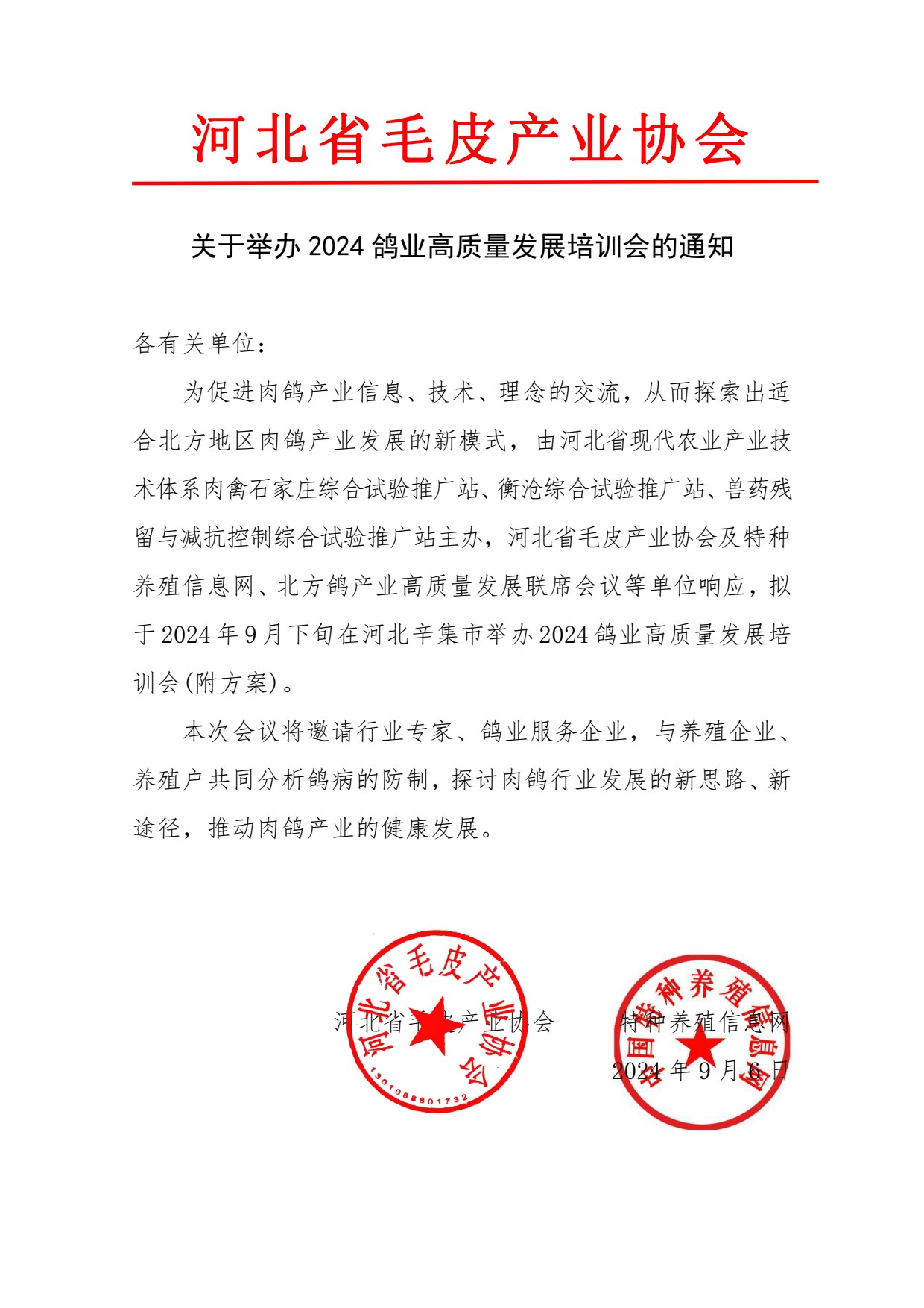 關(guān)于舉辦2024鴿業(yè)高質(zhì)量發(fā)展培訓(xùn)會(huì)的通知