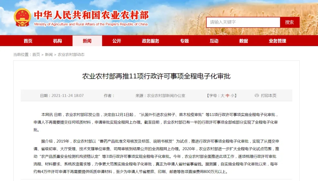 據(jù)介紹,2019年,農(nóng)業(yè)農(nóng)村部以“獸藥產(chǎn)品批準文號核發(fā)及標簽、說明書核發(fā)”為試點,推進行政許可事項全程電子化審批,實現(xiàn)了從提交申請、省級初審、大廳受理、技術支撐單位審查、司局審核到結果公開的全流程網(wǎng)上辦理。2020年,農(nóng)業(yè)農(nóng)村部進一步擴大全程電子化試點范圍,推動“農(nóng)產(chǎn)品質(zhì)量安全檢測機構資格認定”等3項行政許可事項實現(xiàn)全程電子化審批。2021年,農(nóng)業(yè)農(nóng)村部全面推進此項工作,逐項梳理行政許可審批流程、材料要求、系統(tǒng)改造需求等,力爭更大范圍實施全程電子化審批,真正為申請人省時省事省錢。據(jù)測算,自實施全程電子化審批以來,每年約有4萬件許可申請不再需要提供紙質(zhì)申請材料,至少為申請人節(jié)省差旅、印刷、郵寄等各項直接費用800萬元以上。