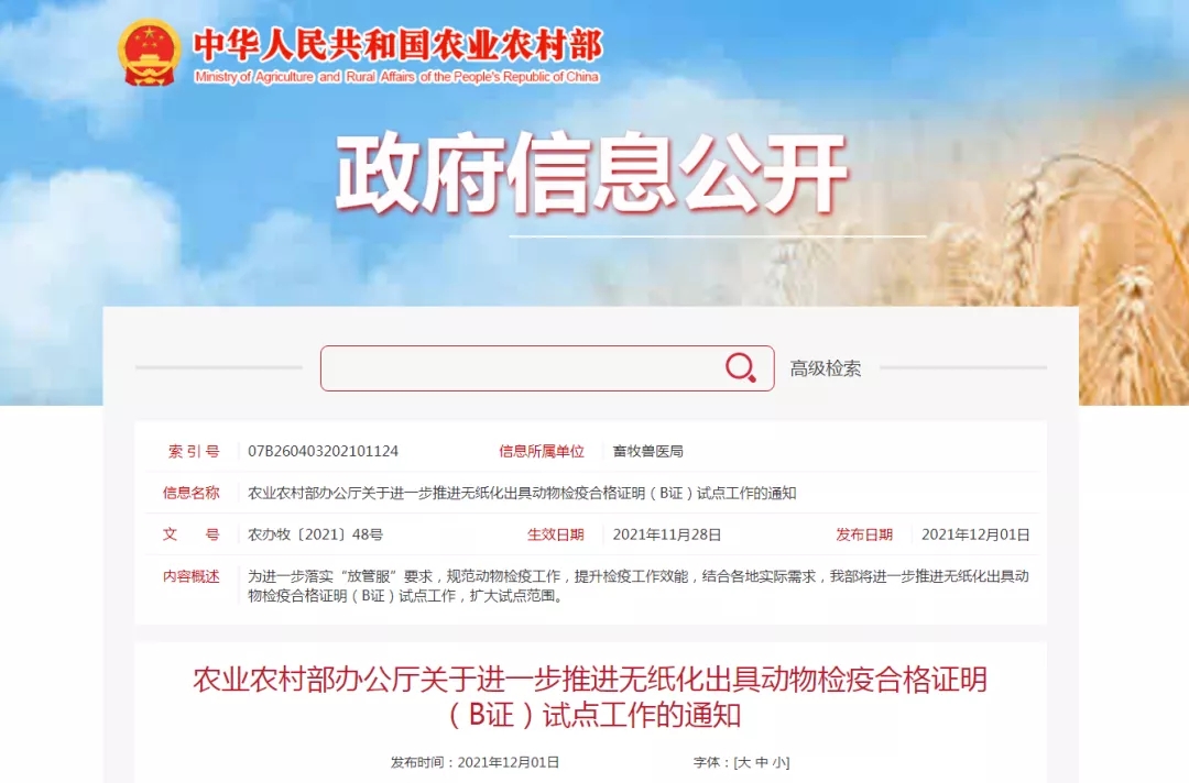 農(nóng)業(yè)農(nóng)村部關(guān)于進(jìn)一步推進(jìn)無紙化出具動(dòng)物檢疫合格證明(B證)試點(diǎn)工作的通知