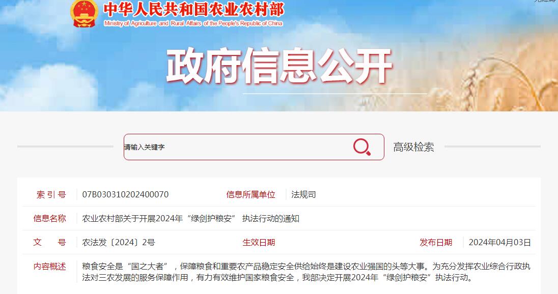 農(nóng)業(yè)農(nóng)村部關(guān)于開展2024年“綠劍護(hù)糧安” 執(zhí)法行動(dòng)的通知