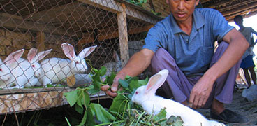 圖為段新安正在用青飼料葡萄葉喂兔子 天山網(wǎng)訊(通訊員劉裕新攝影報道)“我承包紅提葡萄12畝,每天將修剪的葡萄葉帶回家喂兔子,既省飼料又方便,而且肉兔生長比較快,4