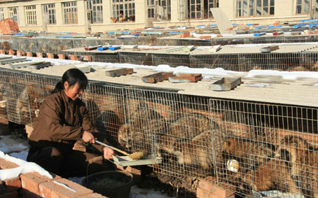 遼寧省義縣劉龍臺信用社在農(nóng)業(yè)結(jié)構(gòu)調(diào)整中,因地制宜大力扶持特種動物養(yǎng)殖,他們所飼養(yǎng)的貂、狐、貉總量已超過萬只,成為當?shù)剞r(nóng)民的搖錢樹,為農(nóng)民帶來可觀的經(jīng)濟效益。圖為義縣劉龍臺鎮(zhèn)白廟子村農(nóng)民趙淑云正在喂種貉。