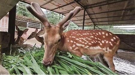 盛夏時節(jié),走進承德縣八家鄉(xiāng)的梅花鹿養(yǎng)殖基地,養(yǎng)殖戶王繼國和工人們正在鹿棚中忙碌。給梅花鹿喂食、打掃鹿舍、收割鹿茸。“2003年就開始養(yǎng)鹿,從開始的六七十只繁殖到現(xiàn)在三百七八十只,年收入能達到三十萬元。”承德縣御鹿元養(yǎng)殖基地負責人王繼國說。