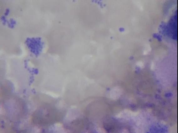 由圖2可見,在視野中含有染色成為葡萄串樣的紫色球菌。