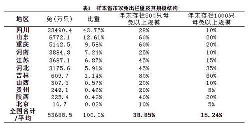 我國家兔養(yǎng)殖的地域差異相對而言還是較大的,規(guī)模最大的是吉林、山東和重慶,年末存欄500只母兔的兔場分別占到80%、60%和60%。而北京、貴州和山西則都比較小,分別僅占到10%、20%和20%。我國最大的家兔主產(chǎn)省四川,其年末存欄500只母兔的兔場約占28%(表1)。