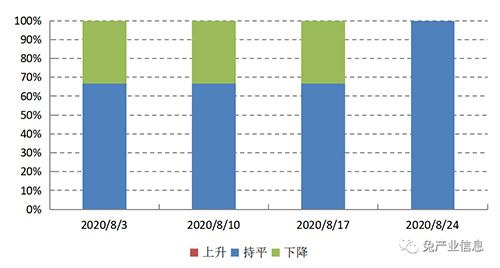 根據(jù)8月份集散地監(jiān)測(cè)結(jié)果,對(duì)于市場(chǎng)的未來(lái)走勢(shì),大部分商戶持中立的態(tài)度。在8月份的四周中,沒(méi)有商戶認(rèn)為銷售情況會(huì)上升,75.00%的商戶認(rèn)為銷售情況會(huì)保持現(xiàn)狀,25.00%商戶認(rèn)為市場(chǎng)表現(xiàn)會(huì)下降,商戶總體態(tài)度中性偏消極(表2)