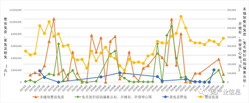 7月份整張兔皮進(jìn)口額為728.13萬(wàn)元,較上月上升16.70%(圖7);未縫制整張兔皮進(jìn)口額為8.65萬(wàn)元,較上月下降65.99%;兔毛制針織鉤編套頭衫、開(kāi)襟衫、外穿背心等進(jìn)口額為0.30萬(wàn)元,較上月下降97.70%。