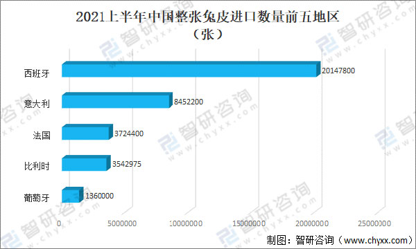 據(jù)中國(guó)海關(guān)數(shù)據(jù),2021上半年中國(guó)整張兔皮從西班牙地區(qū)進(jìn)口數(shù)量最多為20147800張,其次是從意大利地區(qū)進(jìn)口整張兔皮進(jìn)口數(shù)量為8452200張。