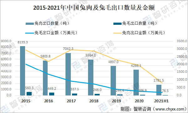 2015-2021年中國(guó)兔肉及兔毛出口數(shù)量及金額