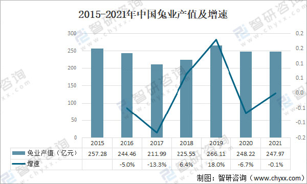 受供給側(cè)結(jié)構(gòu)性改革、環(huán)境保護(hù)政策等影響,我國(guó)兔業(yè)發(fā)展趨緩。2021年中國(guó)兔業(yè)產(chǎn)值約為247.97億元,同比下降0.1%。