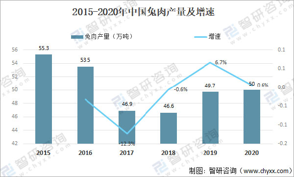 2015-2020年中國(guó)兔肉產(chǎn)量及增速