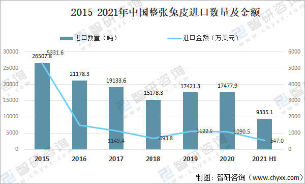 2015-2021年中國(guó)整張兔皮進(jìn)口數(shù)量及金額