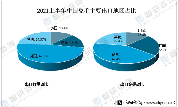 中國(guó)兔毛主要出口至德國(guó)、韓國(guó)及英國(guó)等地區(qū),其中2021上半年中國(guó)兔毛出口至德國(guó)數(shù)量為36020千克,占總兔毛出口數(shù)量的47.1%。