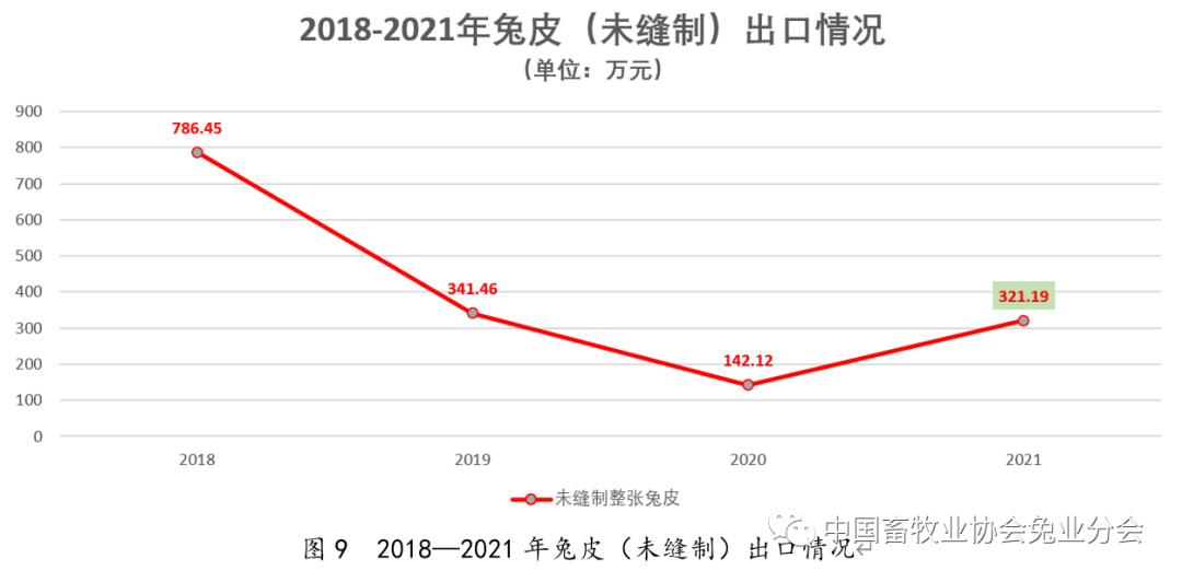1.8.3 兔皮出口 2018年未縫制兔皮出口金額為786.45萬元,2019年下降到341.46萬元,2020年持續(xù)下降到142.12萬元,掉到谷底,2021出現上升到321.19萬元(截至11月份)。