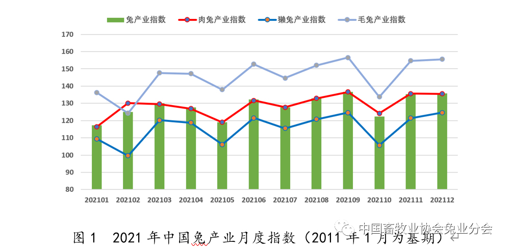 2021年我國兔產業(yè)綜合指數平均保持在125以上,整體向好(兔產業(yè)指數以2011年1月為對比的基礎,即100)。在3—5月份,呈下滑趨勢,由2月份的129.98下降到5月份的118.98,總體下降了8.5%。但進入6月份以后在波動中較快回升,9月達到136.80,10月迅速回落到122.34,11—12月上升到135點以上波動。