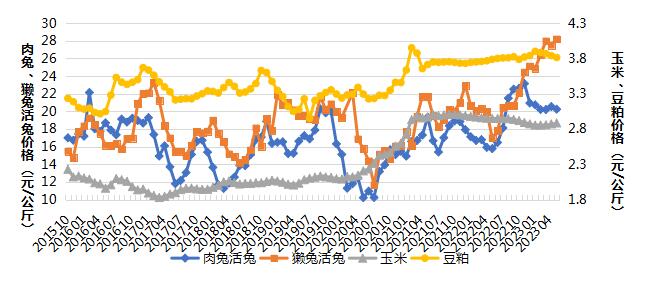圖2 2018年5月-2023年5月兔及兔產(chǎn)品價格走勢(右坐標為兔毛價格)