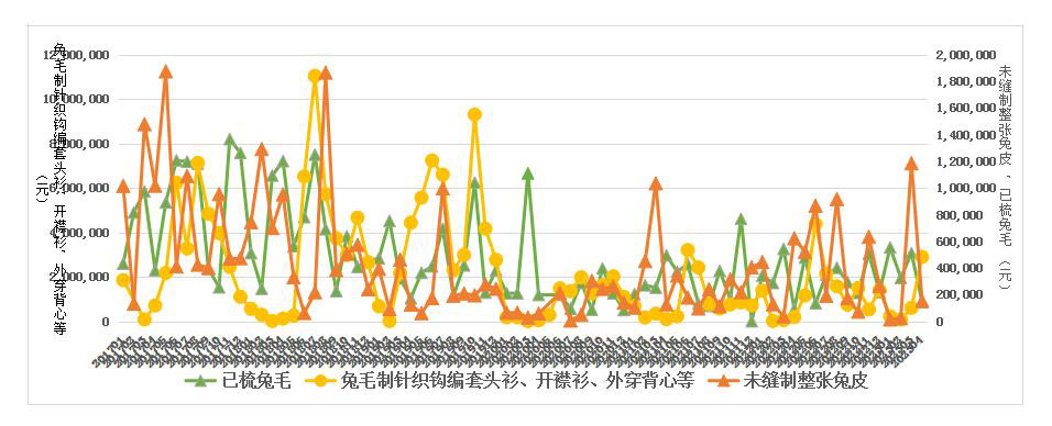 2023年4月份整張兔皮進口額為241.07萬元,較上月增加39.88%;未縫制整張兔皮進口額為0.84萬元(見圖7)。