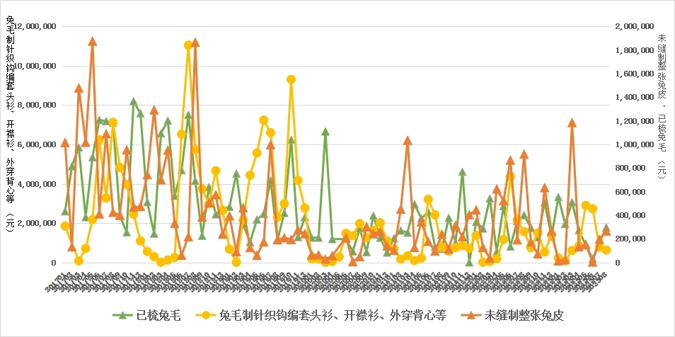2023年8月份整張兔皮進(jìn)口額為367.48萬(wàn)元,較上月上升24.20%;未縫制整張兔皮進(jìn)口額為3960元,較上月下降7.26%(見(jiàn)圖7)。
