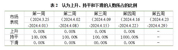 根據(jù)4月份集散地的監(jiān)測結(jié)果得知,商戶總體對未來市場持中立態(tài)度。具體來說,在4月份的五周中,商戶大多認為銷售情況會基本持平,表明了其對市場未來走勢的中立態(tài)度(見表2)。