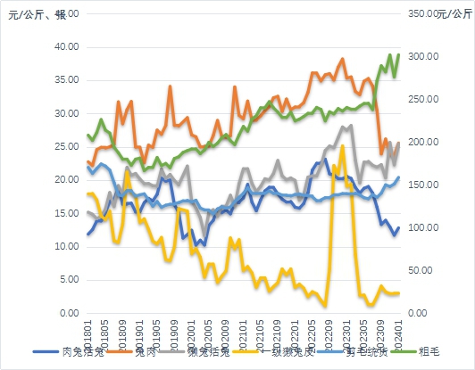 圖2 2018年1月-2024年4月兔及兔產(chǎn)品價格走勢(右坐標為兔毛價格)