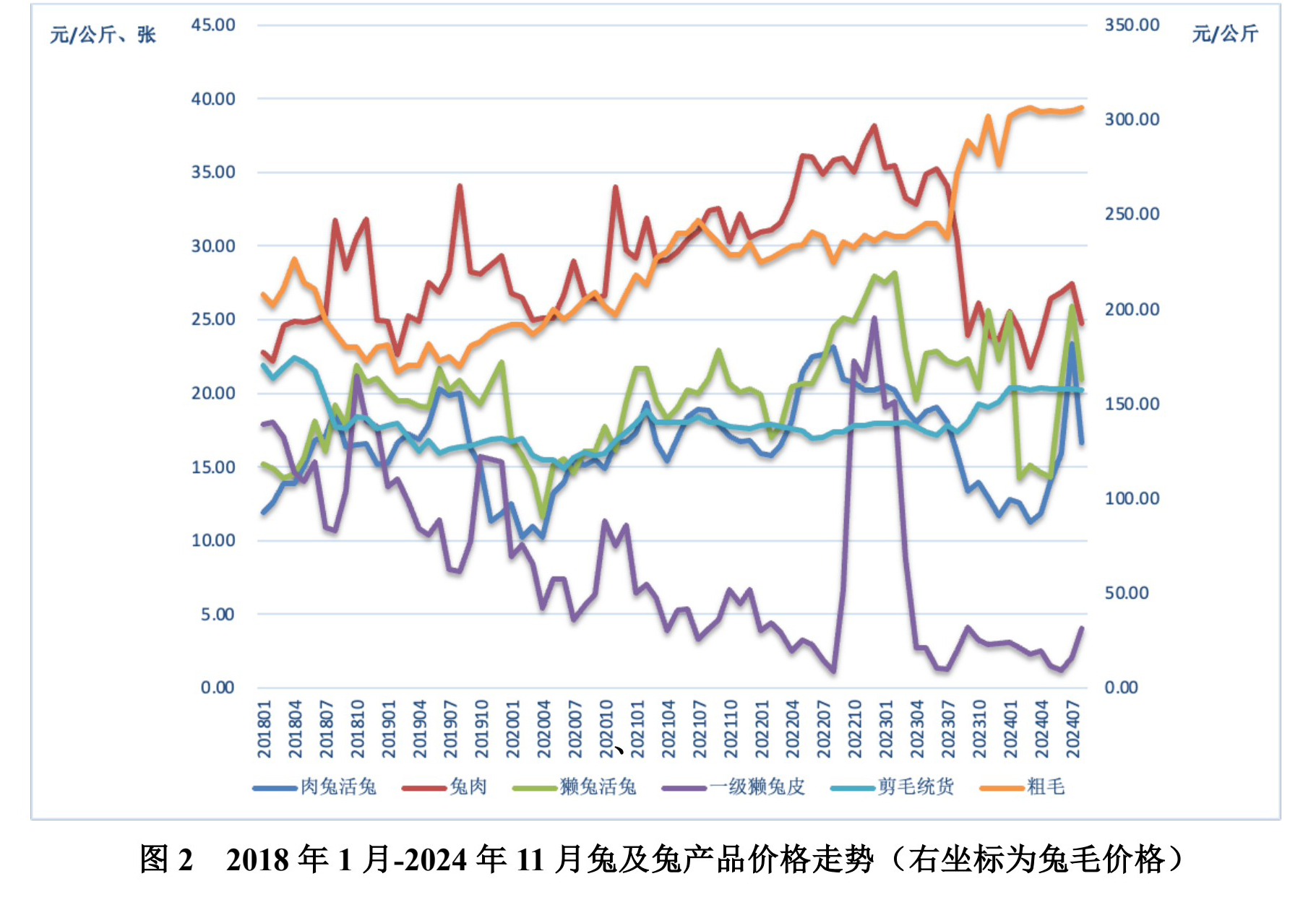 圖2為2018年1月—2024 年11月兔及兔產(chǎn)品月度價(jià)格走勢??傮w來看,粗毛價(jià)格呈上升趨勢,剪毛統(tǒng)貨的價(jià)格雖有波動,但相對比較平穩(wěn),獺兔活兔、肉兔活兔、兔肉和獺兔皮價(jià)格呈現(xiàn)波動變化狀態(tài)。具體來看,肉兔活兔價(jià)格從2024年8月開始回升,10月價(jià)格大幅上漲,比去年同期上漲了30%,達(dá)到近五年同期最高價(jià)格,11月價(jià)格回落,環(huán)比下降29%,與去年同期基本持平;獺兔活兔價(jià)格在2024年前三季度與去年同期比較低,5-8月價(jià)格為近三年低谷,9-10月獺兔活兔價(jià)格上漲較快,2024年10月價(jià)格已超過去年同期價(jià),11月價(jià)格由升轉(zhuǎn)降,環(huán)比下降 19%,與去年同期比下降 5%;兔肉價(jià)格從2023年5月開始下降,2024年1月價(jià)格有所提振,呈現(xiàn)波動回升,但與往年相比,兔肉價(jià)格仍然較低,11月肉兔價(jià)格再次下降,比去年同期低 19%;一級獺兔皮價(jià)格變化趨勢于2024年10月扭轉(zhuǎn),11月價(jià)格達(dá)2024年高點(diǎn)。兔毛產(chǎn)品價(jià)格相對比較平穩(wěn),2023年10月后粗毛價(jià)格出現(xiàn)大幅上漲,2024年4月后基本保持平穩(wěn),僅有微弱調(diào)整;剪毛統(tǒng)貨總體平穩(wěn),2023年9月后波動上升,同樣于2024 年4月之后保持平穩(wěn)狀態(tài),變動較小。