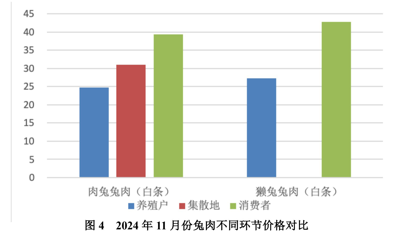 為了考察兔產(chǎn)業(yè)不同環(huán)節(jié)間的獲益情況,體系研發(fā)中心從 2011 年 1 月份開始對養(yǎng)殖戶銷售、集散地交易(批發(fā))和消費(fèi)者價(jià)格進(jìn)行監(jiān)測,并對監(jiān)測點(diǎn)和監(jiān)測內(nèi)容在以后各期逐漸完善。目前對六個(gè)大城市(北京、廣州、上海、福州、成都、重慶)兔肉的消費(fèi)價(jià)格進(jìn)行監(jiān)測,采集于有關(guān)超市。下面以肉兔兔肉和獺兔兔肉不同環(huán)節(jié)的價(jià)格為例,對各環(huán)節(jié)利益分配進(jìn)行分析,其中獺兔兔肉(白條)2024 年 11 月份集散地價(jià)格數(shù)據(jù)缺失(見圖 4)。