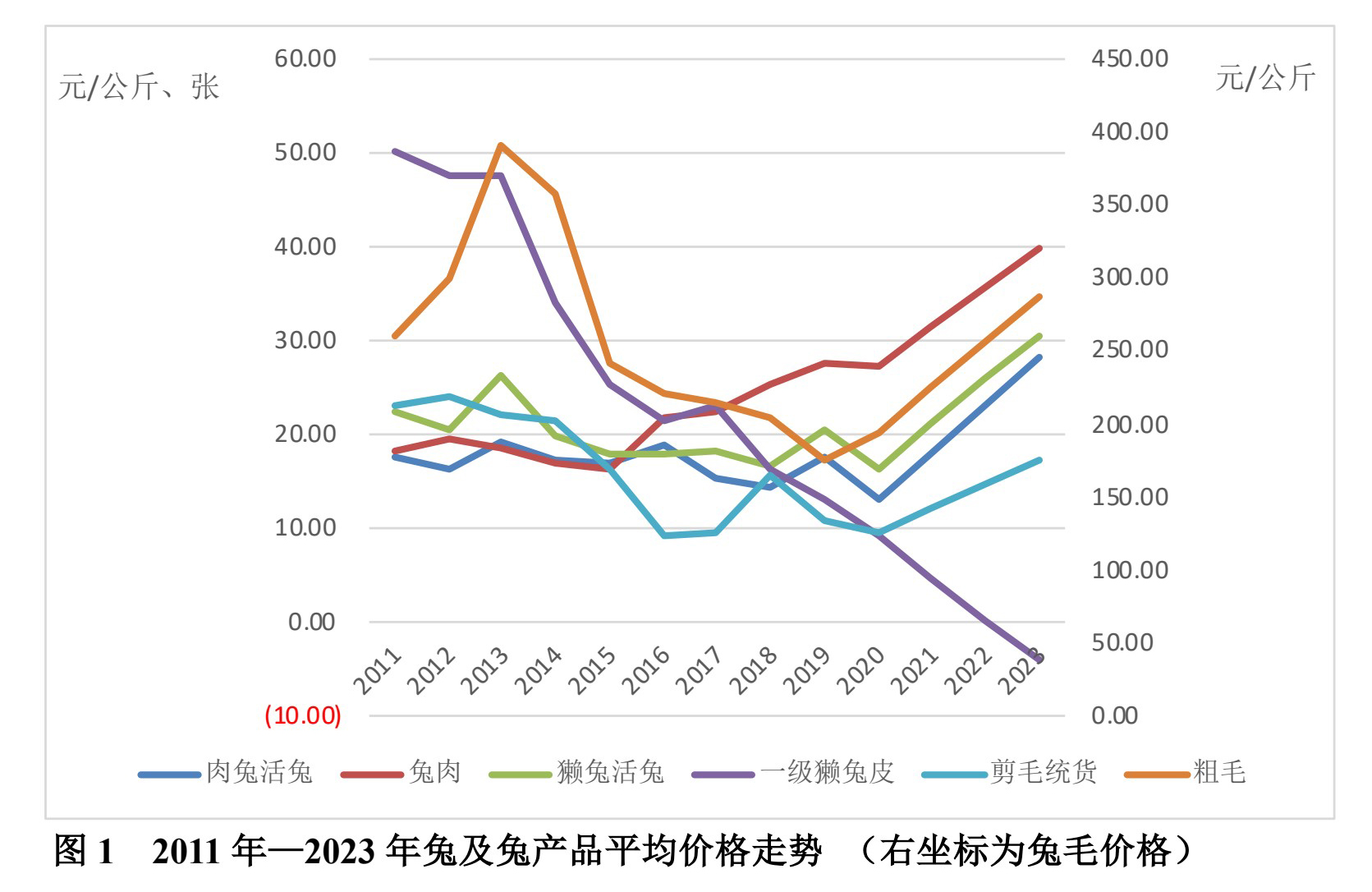 關(guān)注兔產(chǎn)品價(jià)格長期走勢。圖1為 2011年—2023年兔及兔產(chǎn)品年平均價(jià)格走勢,肉兔活兔和獺兔活兔價(jià)格呈上升趨勢,且價(jià)格波動情況類似,兔肉價(jià)格總體也呈上升趨勢;兔毛產(chǎn)品中,剪毛統(tǒng)貨價(jià)格波動幅度較大,近三年呈上升趨勢,粗毛價(jià)格在經(jīng)歷一段時(shí)間的下降后開始回升,近五年不斷上升;一級獺兔皮價(jià)格總體呈下降趨勢。