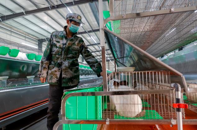 浙江省景寧縣東坑鎮(zhèn)白鶴村肉兔養(yǎng)殖場(chǎng),嚴(yán)家森在觀察肉兔生長(zhǎng)情況。