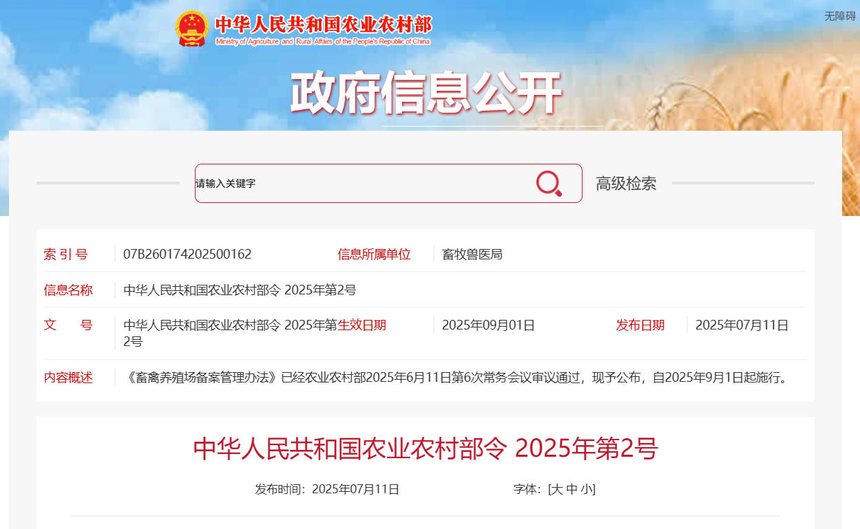 《畜禽養(yǎng)殖場備案管理辦法》已經(jīng)農(nóng)業(yè)農(nóng)村部2025年6月11日第6次常務(wù)會議審議通過,現(xiàn)予公布,自2025年9月1日起施行。