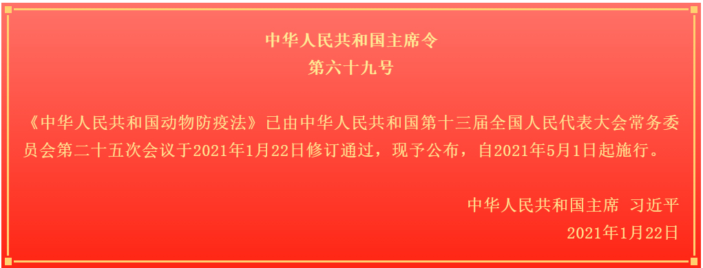 2021年1月22日,十三屆全國(guó)人大常委會(huì)第二十五次會(huì)議審議通過了《中華人民共和國(guó)動(dòng)物防疫》修訂草案,隨即以《中華人民共和國(guó)第69號(hào)主席令》形式公布,自5月1日起實(shí)施。這是