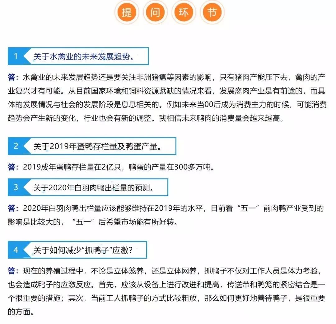 答:目前來看,豬肉短期內(nèi)很難恢復(fù),其市場(chǎng)份額恢復(fù)到63%比較困難,在此期間,鴨肉就能發(fā)揮替代作用。在未來,如何能把2019年肉鴨的市場(chǎng)占有率增長(zhǎng)繼續(xù)保持下去,需要思考。強(qiáng)調(diào)一點(diǎn),我們所有的養(yǎng)殖企業(yè),都應(yīng)該思考把養(yǎng)殖企業(yè)變成食品加工企業(yè),提高附加值。