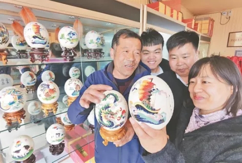 趙金柱(左一)在展示用鴕鳥蛋雕刻的工藝品
