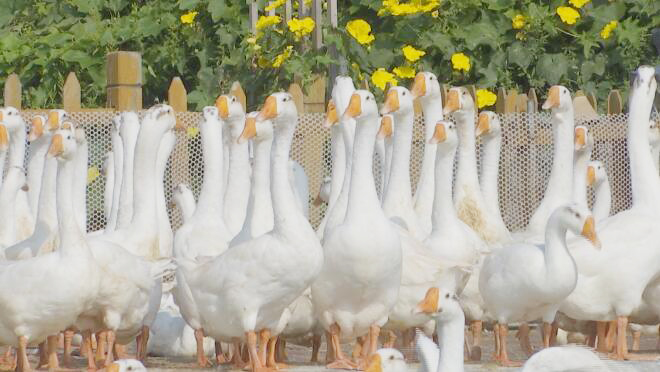 產(chǎn)業(yè)興旺發(fā)展是鄉(xiāng)村振興的關(guān)鍵,黃埠鎮(zhèn)常莊村積極打造“一村一品”,在有關(guān)部門的大力幫扶下,種植業(yè)、養(yǎng)殖業(yè)齊頭并進(jìn),發(fā)展特色養(yǎng)殖和種植。鵝糞能夠作為有機(jī)肥增加土壤肥力,以草養(yǎng)鵝、鵝糞肥林為一體形成生態(tài)良性循環(huán)、綠色發(fā)展。郭全威介紹:“弘羽養(yǎng)殖專業(yè)合作社是咱們?nèi)A錄集團(tuán)在2020年投資建設(shè)的養(yǎng)殖合作社,目前飼養(yǎng)肉鵝5000余只,年初產(chǎn)量可達(dá)10000余只,為村集體經(jīng)濟(jì)貢獻(xiàn)將近51萬(wàn)元的收益,收益主要是用于村里的基礎(chǔ)設(shè)施建設(shè),以及帶動(dòng)脫貧戶就業(yè)。”