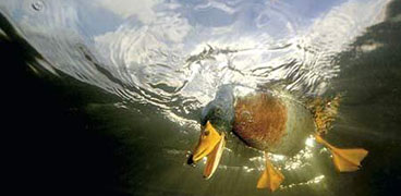 綠頭鴨潛入水中捕食 新浪科技訊 北京時(shí)間2月18日消息,據(jù)英國(guó)《每日郵報(bào)》報(bào)道,英國(guó)的一名攝影師最近拍到一張令人驚奇的照片:一只綠頭鴨伸著黃色的長(zhǎng)喙,雙眼緊盯著水下的